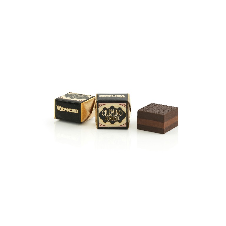 Lapisan cokelat hitam dengan pasta almond di antara dua lapisan dark gianduja.